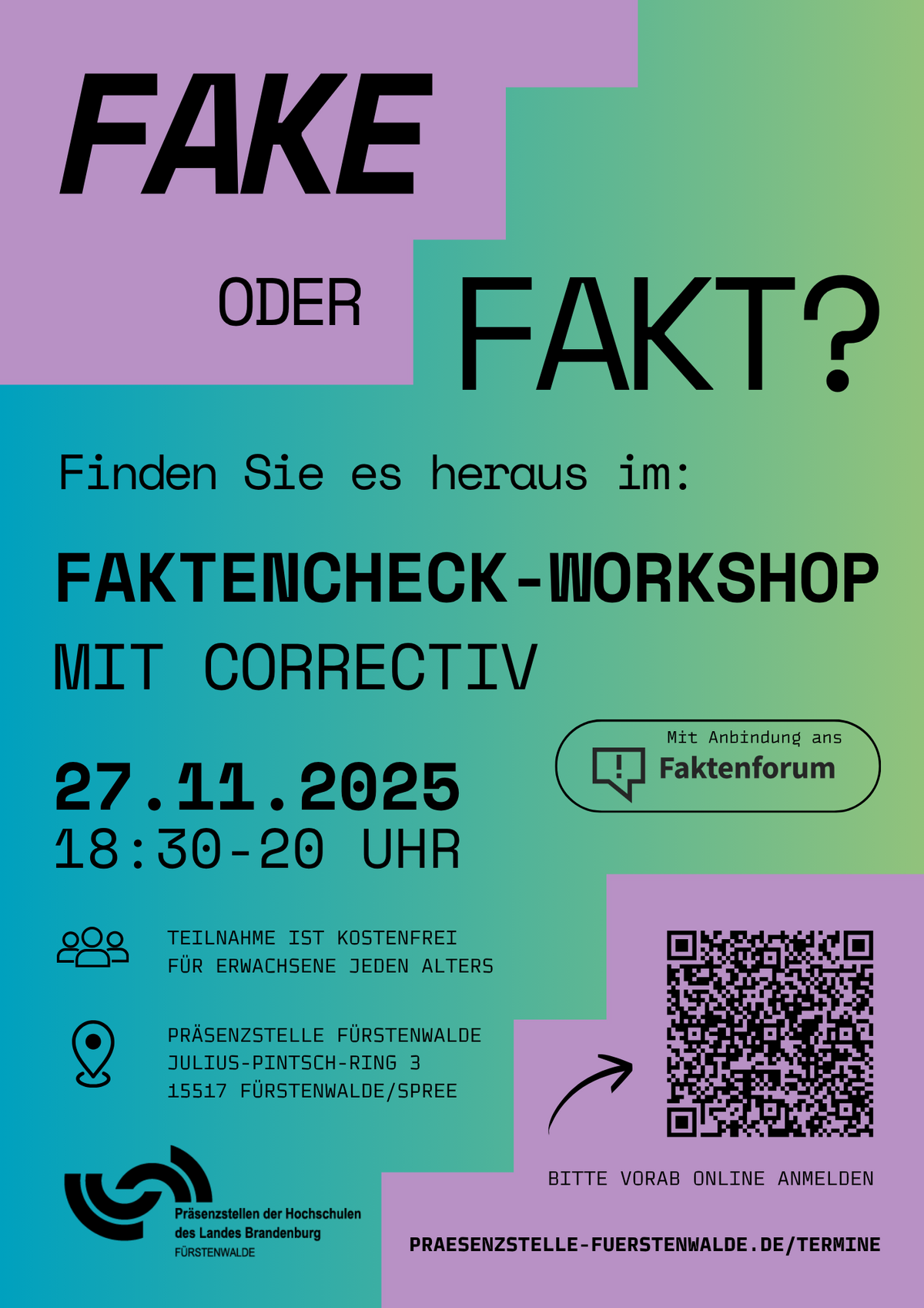 Bereits 2023 haben die Fürstenwalderinnen und Fürstenwalder spannende Einblicke in die Forschung zu Desinformation und Fake News erhalten. Jetzt geht es einen Schritt weiter: Werden Sie selbst aktiv!