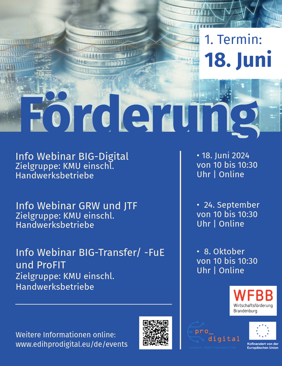 Förderanträge sind komplex, aber stellen einen großen Nutzen für Unternehmen dar. Deshalb ist unser Anliegen, diesem bürokratischen Aufwand zu minimieren. Wir haben für dieses Jahr zusammen mit dem WFBB eine Workshop-Reihe vorbereitet, die KMUs in der Region einen guten Blick über die aktuellen Fördertöpfe für Ihr Digitalisierungsvorhaben gibt. Sie erfahren, welche Maßnahmen in welchem Umfang gefördert werden können und erhalten gleichzeitig kompakt Informationen über Förderfähigkeit und welche weiteren Schritte notwendig sind.