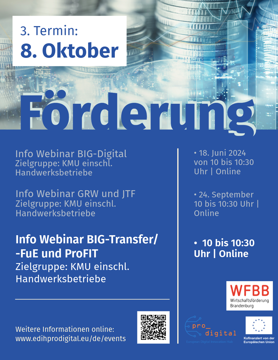 Wann: 8. Oktober 2024 | 10 – 10:35 Uhr | Anmeldung: https://edihprodigital.eu/de/event/foerdermoeglichkeiten-big-transfer-fue-und-profit